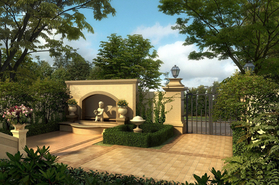 對歐式別墅小庭院設計鋪地的特色的把握,其他一些形式會產生更強的靜態感。如正方形、圓形和六邊形等規則,對稱的形狀都會引起運動感而會形成寧靜的氛圍,在鋪裝一些休閑的區域時使用,效果很好。