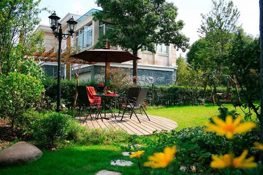 1、建筑物:在別墅的庭院里,矮墻、平臺、走廊、假山等建筑物是擋不住視線的,他們可以區分庭院的空間來限制入口,不會把院子變窄,戶外生活很重要,用原木做的亭子一樣的構造和平臺可以用來觀賞和休息。